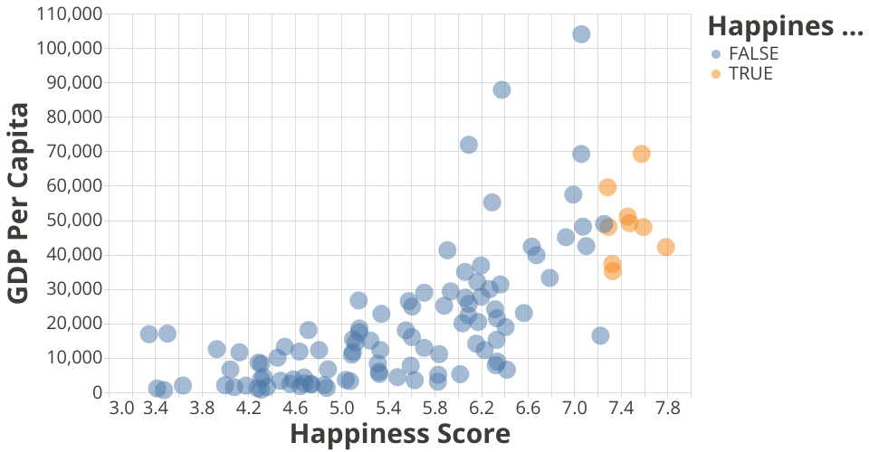 A country’s overall happiness score is a composite of different factors including GDP per capita, healthy life expectancy and perceptions of corruption etc.