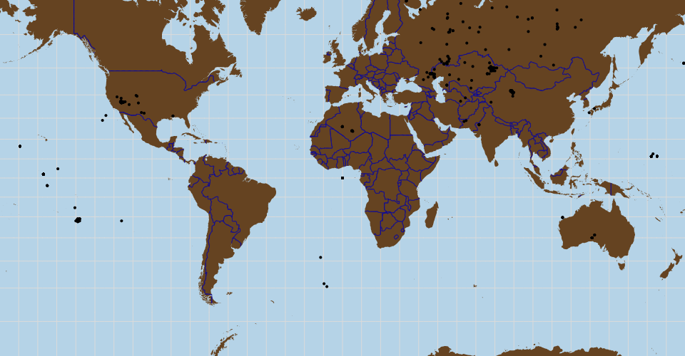 World Atlas TopoJSON. The points are off by a small fraction (down and to the left) however it fits much better on the Mercator projection over the Natural Earth projection. When the user hovers over each point, they can see the latitude and logitude of that deployment.