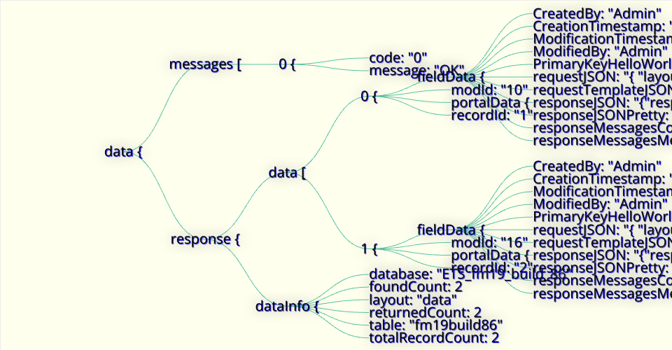 What's special about the returned data, is that the record data (data.response.data[n|.fieldData) is TWO levels below the data array table container (data.response.data) ... There is a metadata tag 'fieldData' in between.
