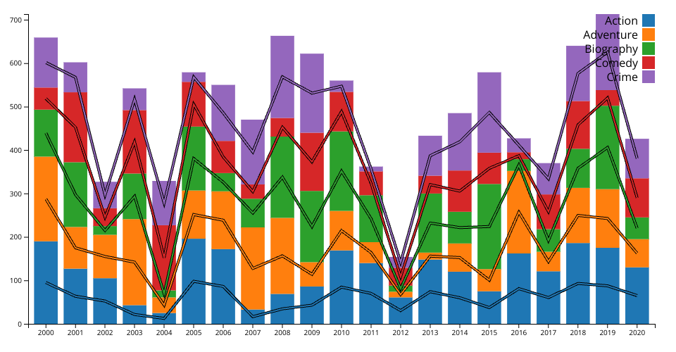 The data used in this chart is fake data generated for demonstration purposes. It was designed to simulate movie release patterns for genres such as Action, Adventure, Biography, Comedy, and Crime over the years 2000 to 2020.
