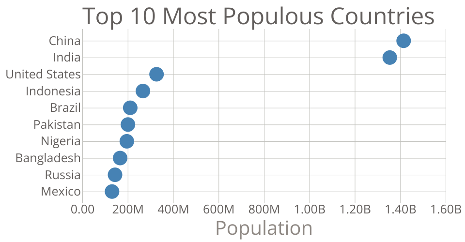 This bar chart shoes population of the top 10 most populous countries. The data comes from the year 2018 estimate in [United Nations: World Population Prospects 2017].