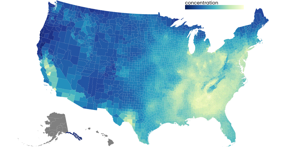 A US map showing the PM2.5 concentration of counties in 2000 with color legend.