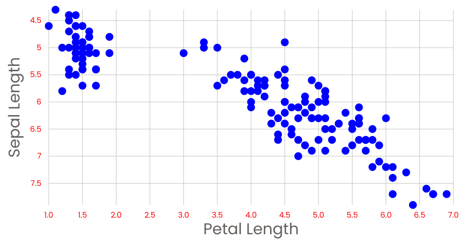 A scatter plot showing the Iris dataset and the relationship between Petal Length and Sepal Width (adaptable to any variable) using D3 and React.