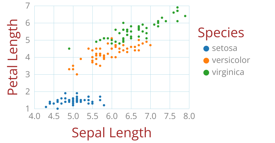 This visualization shows The Iris Dataset. It's designed to emphasize clustering by Petal Length and Sepal Length by Species.