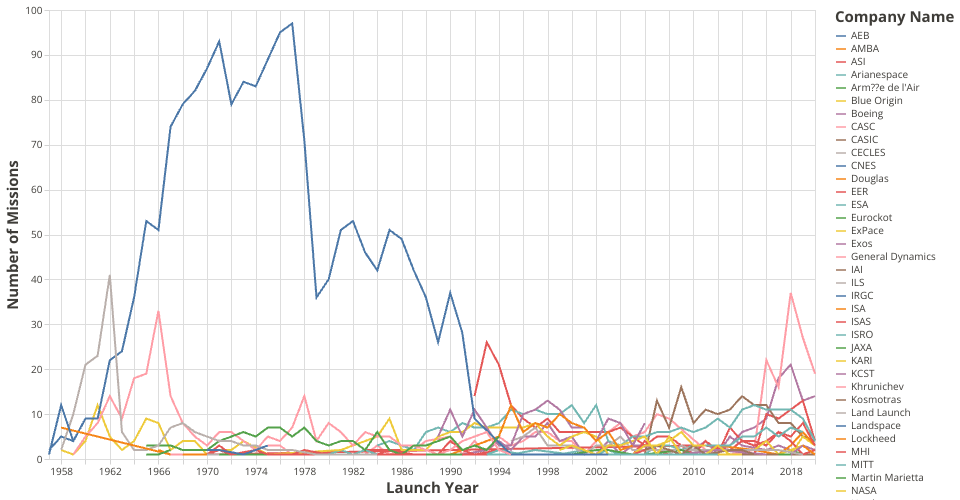 This Line Chart shows the number of launches per year ranging from 1950 to 2020 where each company is represented by a different color and the number of launches are shown as the tooltip on hover. The visualization is constructed using the vega-lite-api.