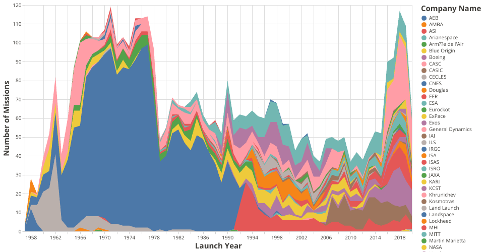 This Stacked Area Chart shows the number of launches per year ranging from 1950 to 2020 where each company is represented by a different color and the number of launches are shown as the tooltip on hover. The visualization is constructed using the vega-lite-api.