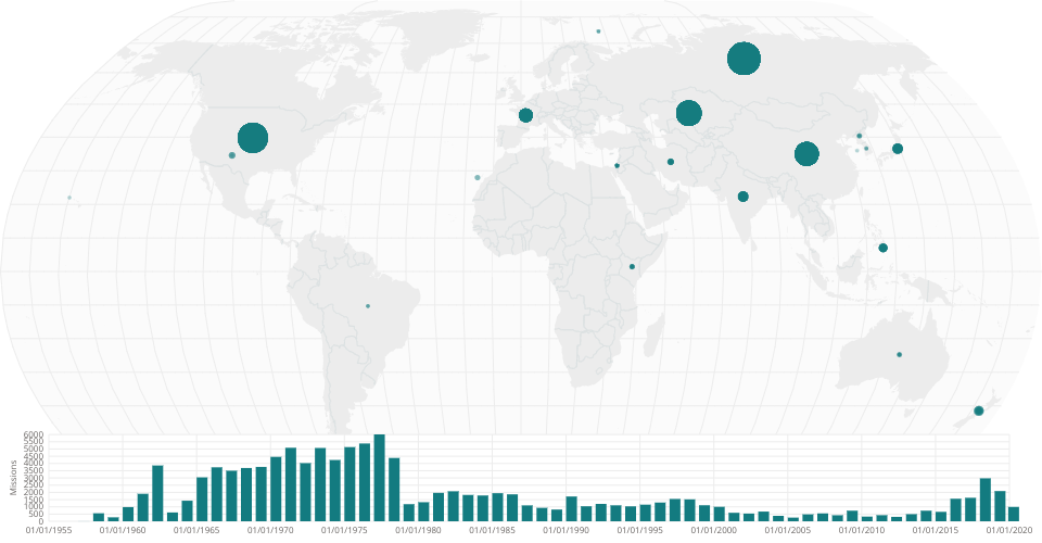 A world map showing Number of Space Missions by Country with Brusing.