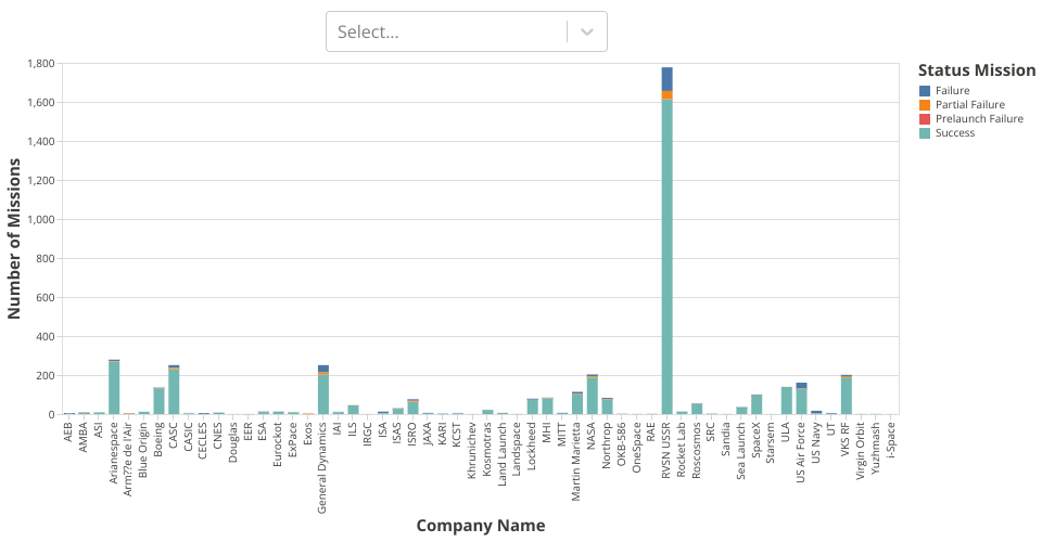This Stacked Bar Chart shows the number of missions that were executed by each company and the status of those missions is represented by a different color and the number of missions in a particular status is shown as the tooltip on hover. The visualization is constructed using the vega-lite-api.