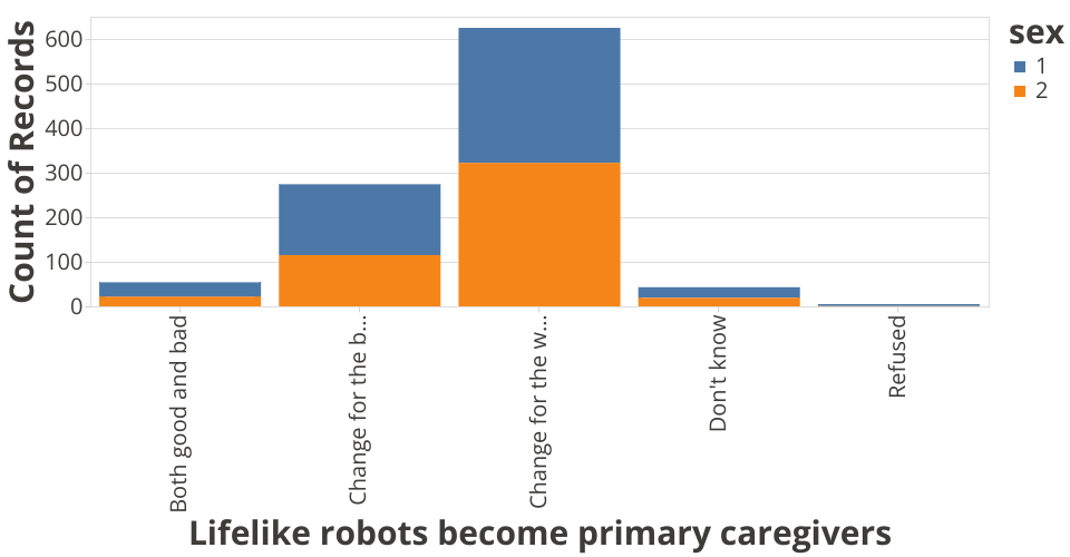 A visualization of the dataset showing what people think if lifelike robots become the primary caregivers for the elderly or disabled. It also shows that there is no correlation between the sex and the question.