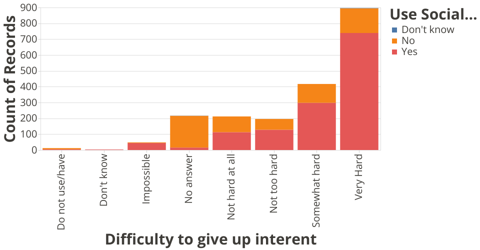 A visualization of the dataset of How Interent users think of the Impacts of Social Media that show how easy or hard it is for Interent users to give up the Interent and if it corrolates to the use of social media.