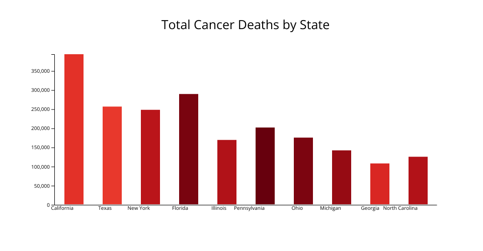 Visualization of total cancer deaths by state from the CORGIS dataset made with D3. Color legend and threshold code from Susie Lu.