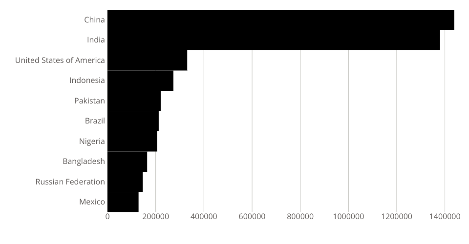 A program that shows the top 10 most populous countries as a pathetic bar chart with no axes.