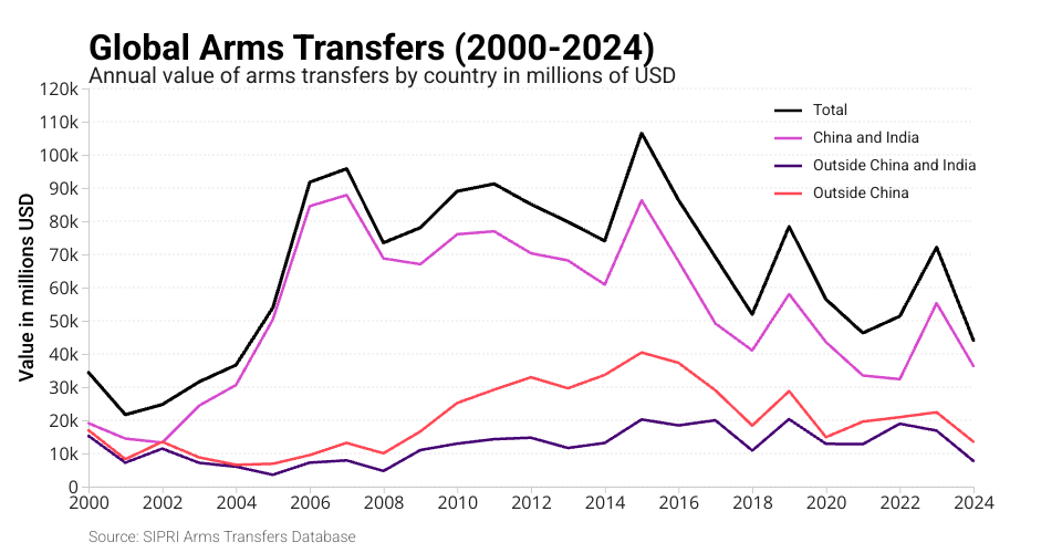 This visualization shows the annual value of arms transfers from 2000 to 2024, focusing on global totals and key regional aggregations.