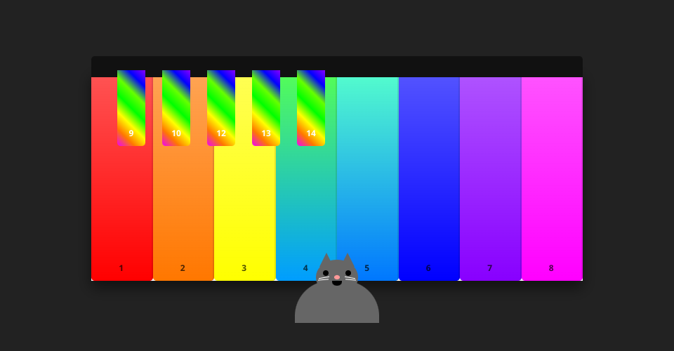 This visualization creates an interactive piano interface using HTML, CSS and Web Audio API. The piano features: