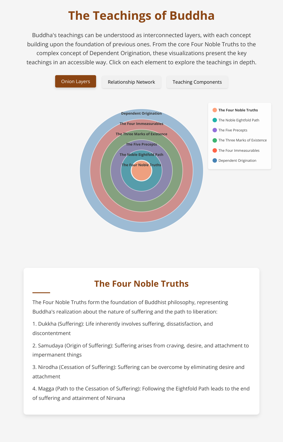 The core visualization represents Buddha's teachings as concentric circles, with each layer building upon the foundation of previous ones. From the central Four Noble Truths to the outer concept of Dependent Origination, this visualization demonstrates the layered nature of Buddhist philosophy.