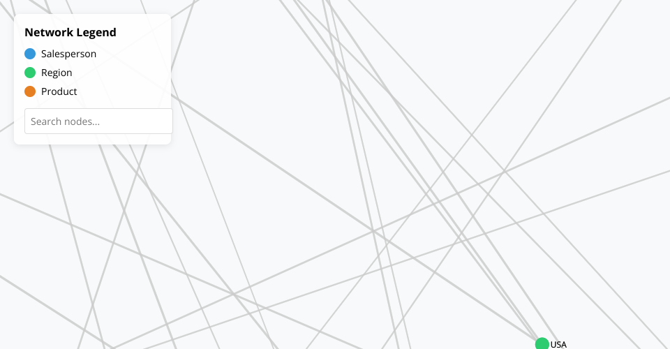 - Node Types: Color-coded nodes distinguishing between salespeople, regions, and products