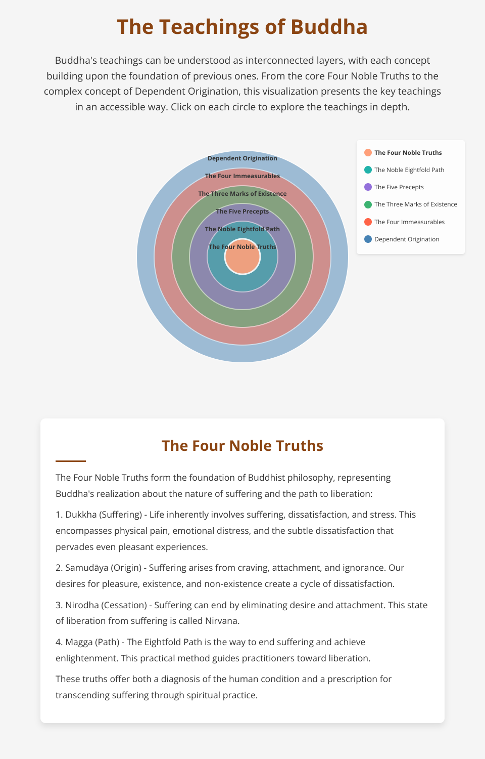 An interactive visualization that presents the core teachings of Buddha as concentric circles, representing how these concepts build upon each other from the foundational Four Noble Truths to more complex Buddhist philosophies.