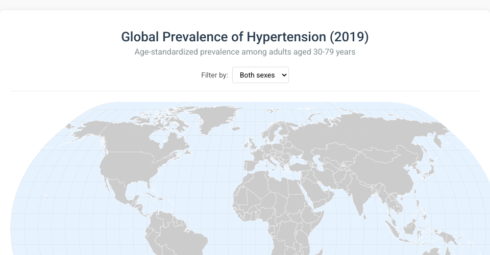 - Interactive world map visualization showing hypertension prevalence rates by country