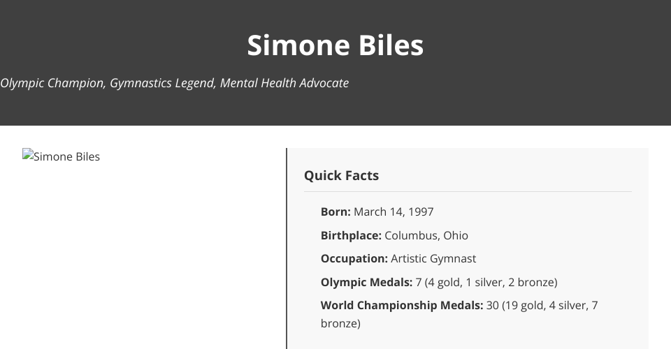 A traditional web page presenting a comprehensive biography of Simone Biles, Olympic gold medalist and world champion gymnast.