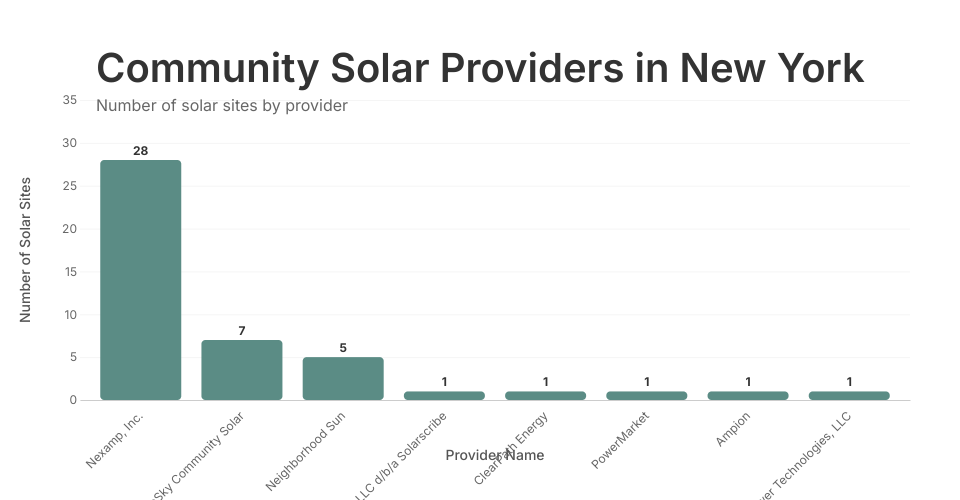 This visualization shows the number of solar sites operated by different community solar providers in New York state. The data is sourced from a CSV file containing information about solar providers, their locations, and utility companies.