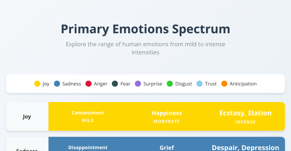 Primary Emotions Spectrum Core Emotion Mild Moderate Intense Joy Contentment Happiness Ecstasy, Elation Sadness Disappointment Grief Despair, Depression Anger Annoyance Frustration Rage, Fury Fear Apprehension Anxiety Terror, Panic Surprise Distraction Amazement Shock, Astonishment Disgust Dislike Aversion Loathing Trust Acceptance Affection Love, Devotion Anticipation Interest Expectation Vigilance, Eagerness