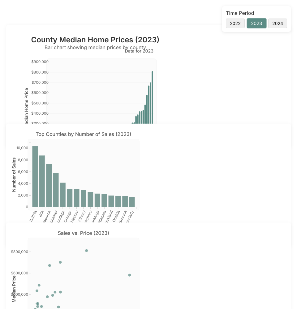 Interactive visualization dashboard showing median home prices and sales data for counties across New York state.