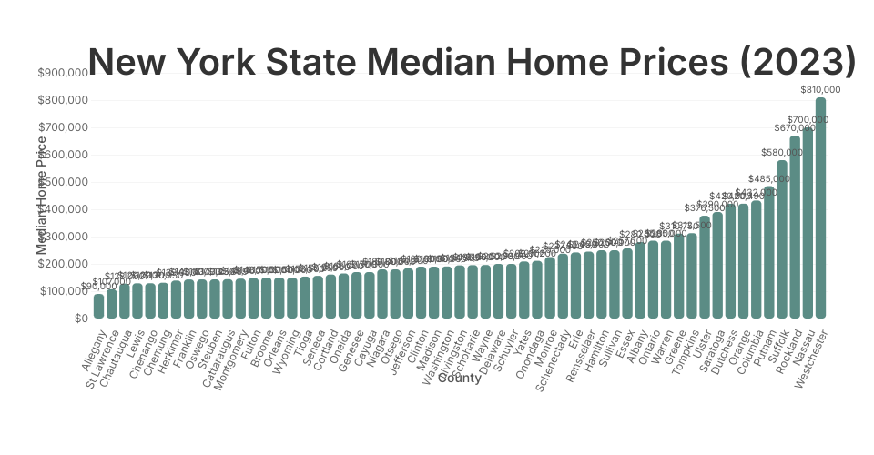 This visualization displays the median home prices across different counties in New York State for 2023.