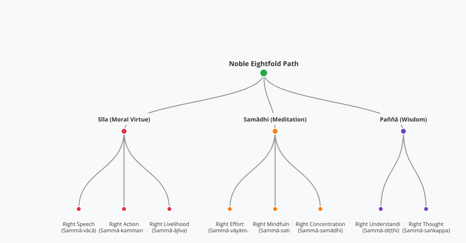 An interactive D3.js visualization of the Buddhist Noble Eightfold Path, organized into three main categories: