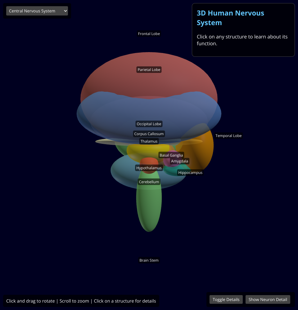 This interactive 3D visualization allows users to explore the human nervous system, including: