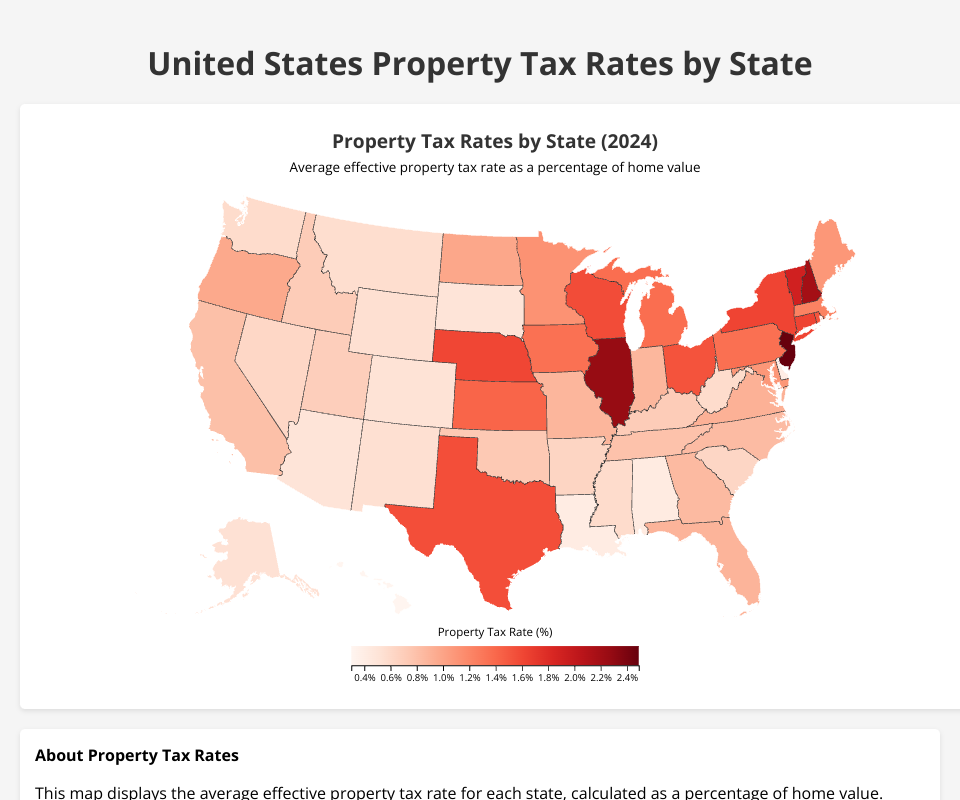 - Interactive map displaying property tax rates by state