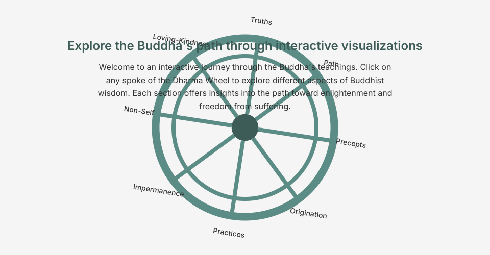 An interactive visualization of Buddha's teachings using a Dharma Wheel as navigation. Each spoke of the wheel represents a different teaching or aspect of Buddhist philosophy.