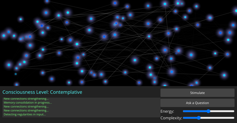 This project creates an interactive simulation of an emergent consciousness model based on a neural network visualization. It displays neurons that form connections, activate based on stimuli, and generate "thoughts" to simulate a rudimentary form of consciousness.