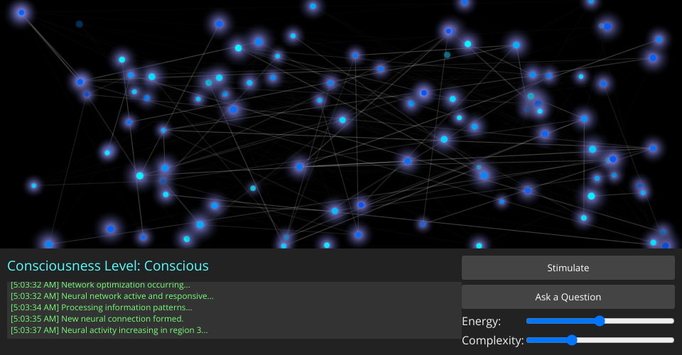 This project creates a visual and interactive simulation of emerging consciousness as a complex, self-organizing neural network. It aims to represent some of the fundamental aspects of consciousness, including: