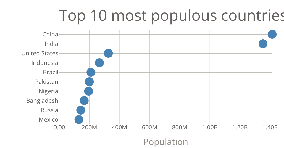 This bar chart shows population of the top 10 most populous countries. The data comes from the year 2018 estimate in United Nations: World Population Prospects 2017.