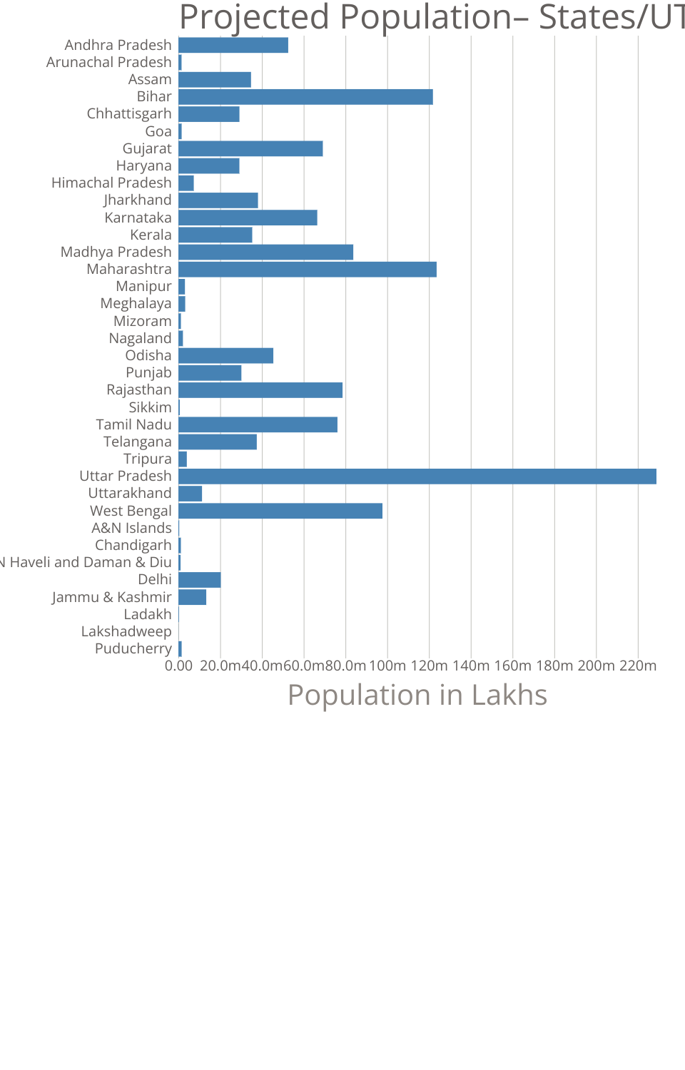 This bar chart shows population of the Projected Population– States/UTs India 2020. The data comes from Projected Population– States/UTs.