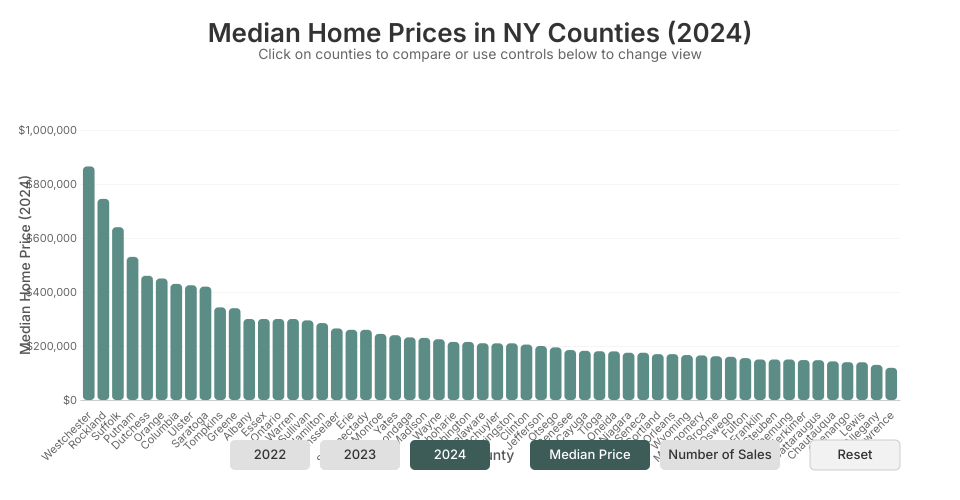 This interactive visualization shows housing market data for New York counties from 2022 to 2024. Users can: