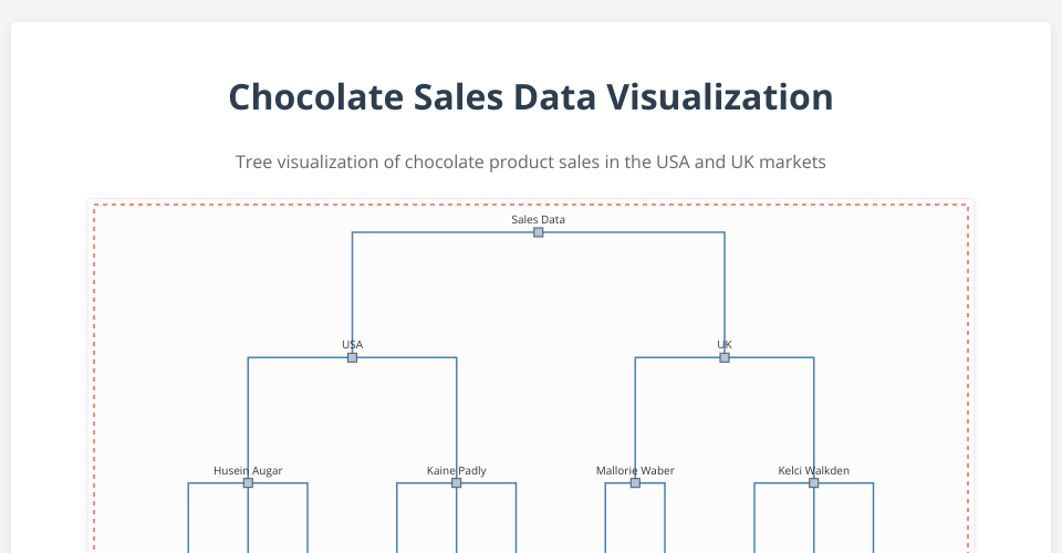 This project visualizes chocolate product sales data in the USA and UK using a hierarchical tree structure. The visualization shows sales representatives, their products, and sales values.