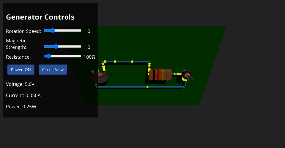 This interactive 3D simulation demonstrates how an electrical generator works. The simulation includes:
