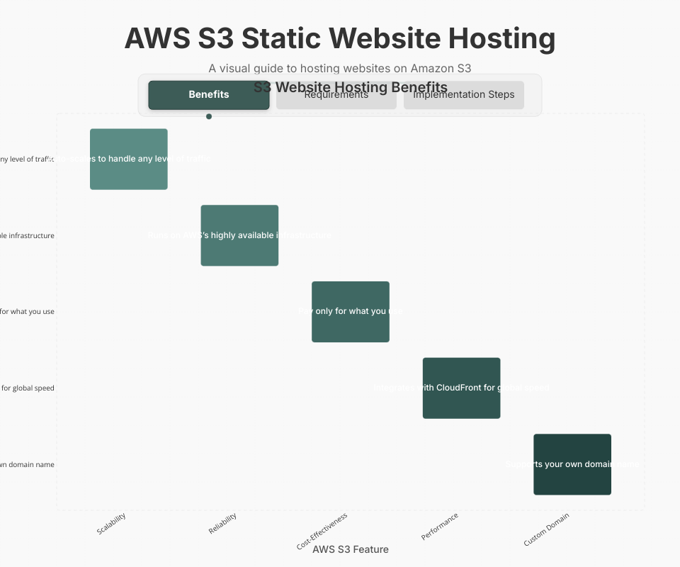 - Benefits: Explore the advantages of S3 static website hosting with interactive bars
