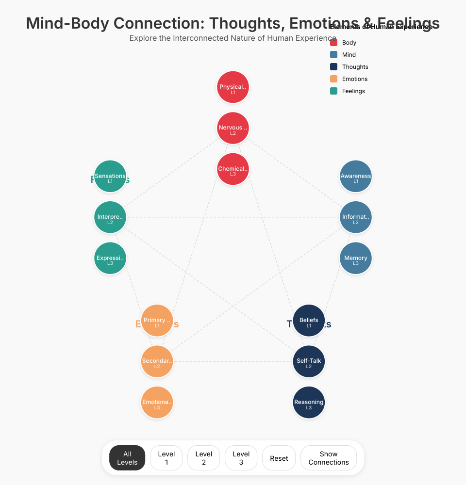 An interactive data visualization exploring the interconnected nature of human experience across five domains: Body, Mind, Thoughts, Emotions, and Feelings.