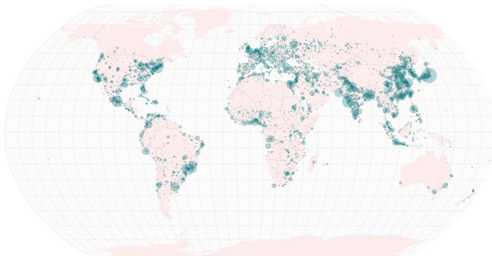 A world map showing cities with population greater than 50,000. City data from Simplemaps: World Cities Database.