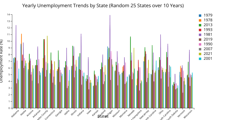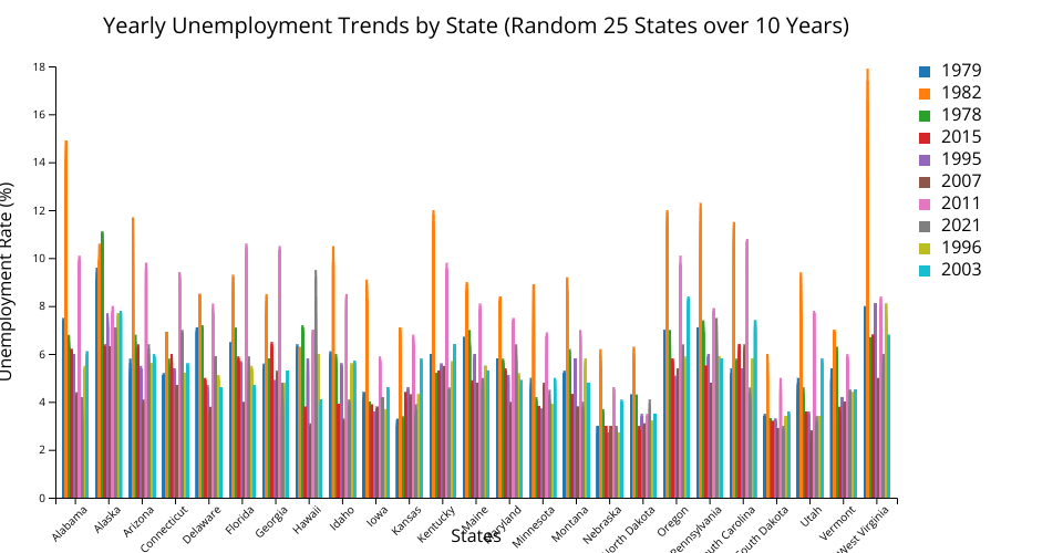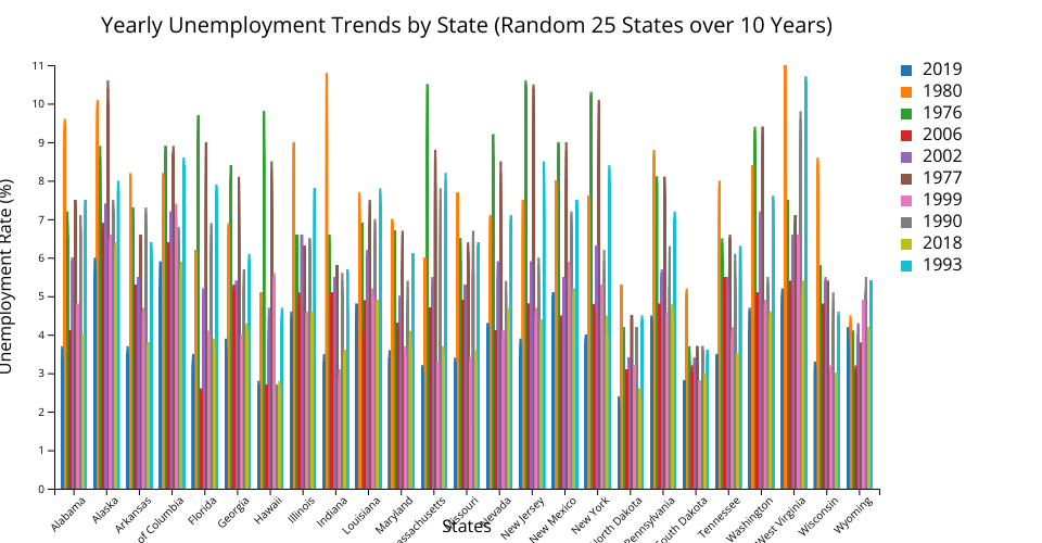 The project uses D3.js to create an interactive grouped bar chart that visualizes unemployment rates across different states over multiple years. The chart allows users to select a specific year and view the corresponding unemployment rates for each state.