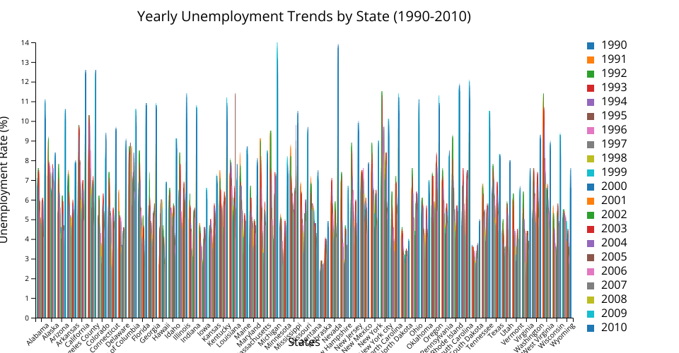 The project uses D3.js to create an interactive grouped bar chart that visualizes unemployment rates across different states over multiple years. The chart allows users to select a specific year and view the corresponding unemployment rates for each state.