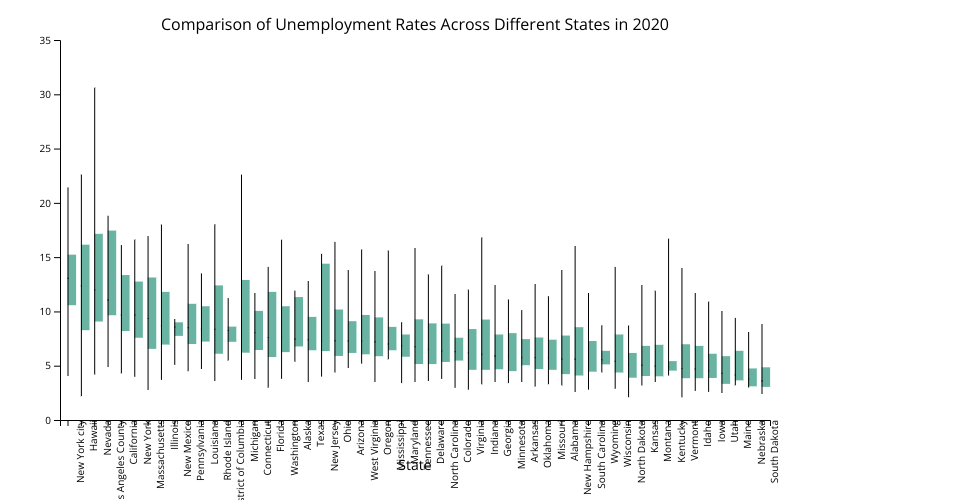 Unemployment Rate Box Plot Visualization This project visualizes unemployment rate data across various U.S. states for the year 2020. Using D3.js, it presents a box plot to highlight the distribution of unemployment rates, showing median, quartiles, and range (min-max) for each state. This is part of a data visualization project aimed at making statistical data on employment more accessible and insightful.