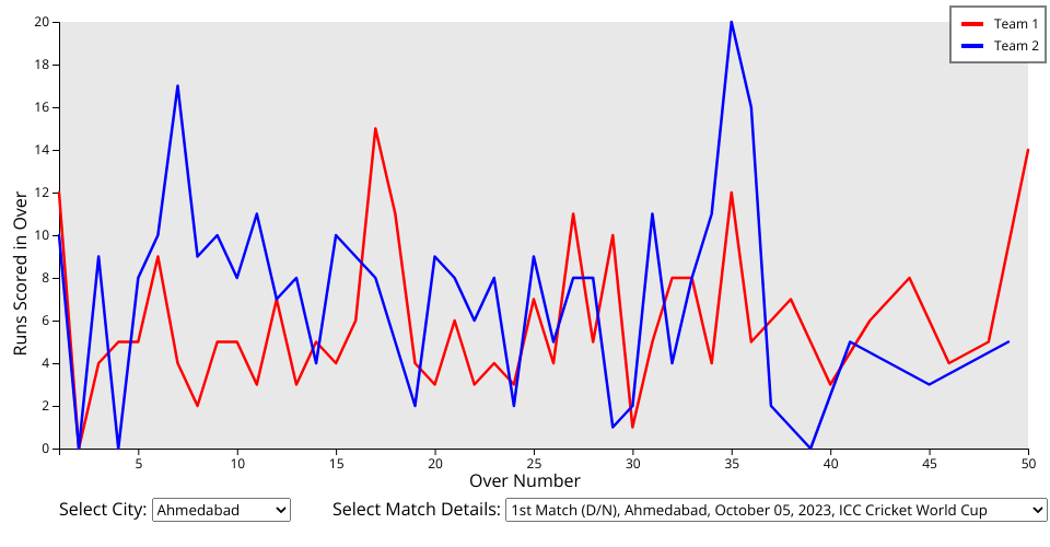 Implemented the line graph chart for each match of each city where you can see runs scored through each over in that particular match.