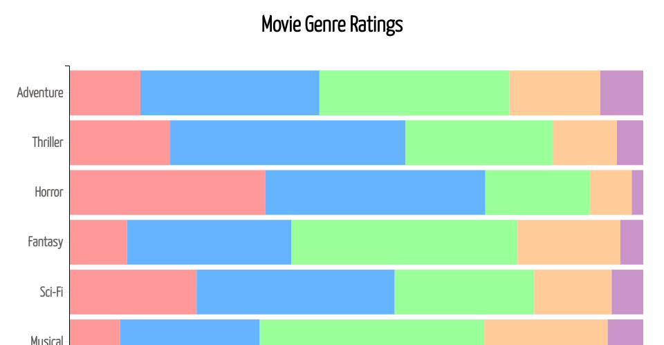 This stacked bar chart gives the percentage of each rating level within different movie genres. The aim is to show the impact of genre on movie ratings. When the mouse hovers over each bar, you can see pop-ups of accurate percentage of each rating level within each genre. Total percentage is 1, representing 100%.