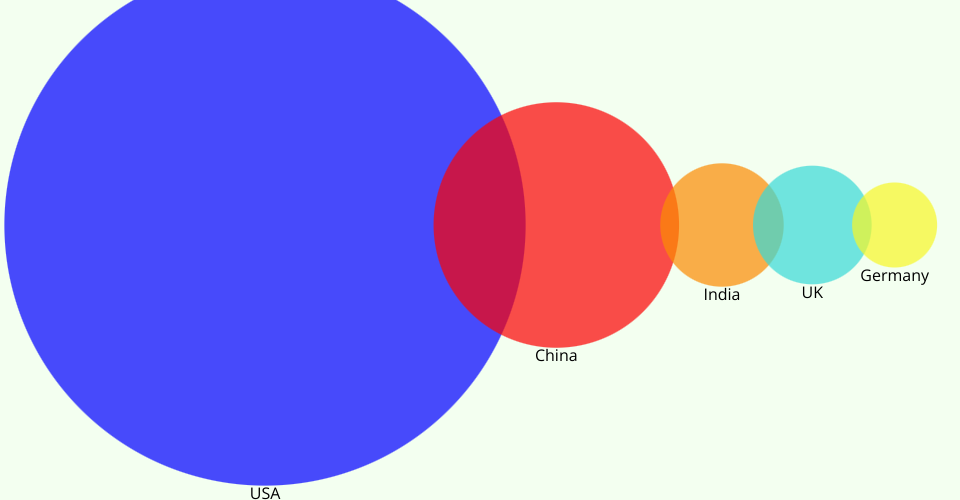 This transition chart displays the top 5 countries ranked according to their investment in artificial intelligence in 2023. This was modeled on Prof. Curran's solar system size and distance chart but with an emphasis on size rather than distance.