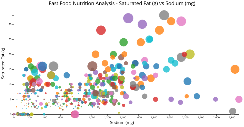 CS573 Final Project Chart showcasing a responsive Saturated vs Sodium levels scatter plot for menu items belonging to six of the most popular fast food restaurants.
