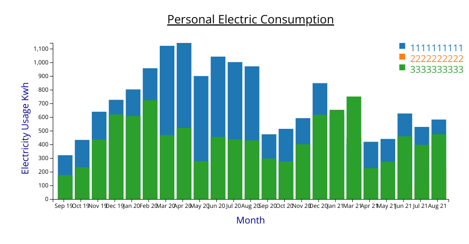 A bar chart visualization of my personal electricity consumption dataset. I live in a three family structure and occupy two floors. There is also a common account that supplies the front and back hall lighting as well as the basement and exterrior outlets. It covers a period of two years.
