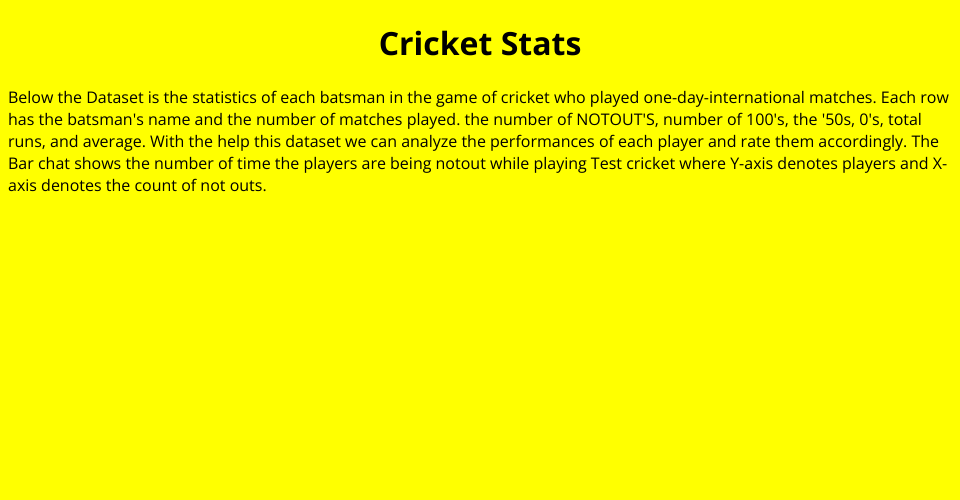 The Dataset is the statistics of each batsman in the game of cricket who played one-day-international matches. Each row has the batsman's name and the number of matches played. the number of NOTOUT'S, number of 100's, the '50s, 0's, total runs, and average. With the help this dataset we can analyze the performances of each player and rate them accordingly.